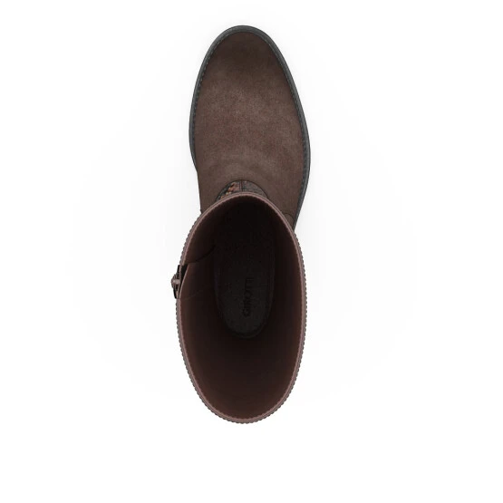 La partie inférieure est en cuir estampé, daim. La partie intérieure / la doublure est en cuir.